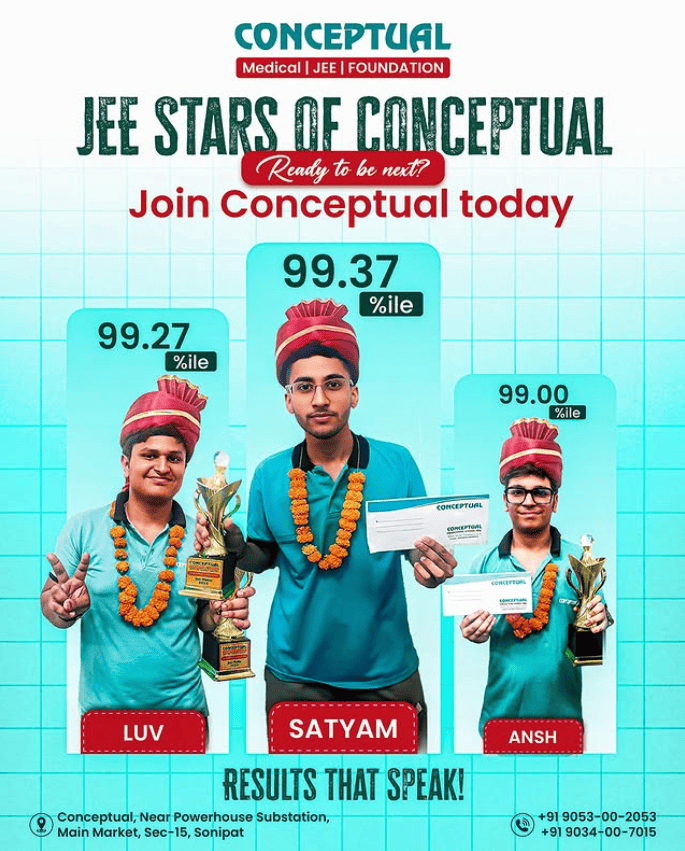 Conceptual Academy is Sonipat’s most trusted NEET, JEE & Foundation coaching hub. We combine clarity-focused teaching, small-batch mentoring, and consistent testing to turn potential into performance.